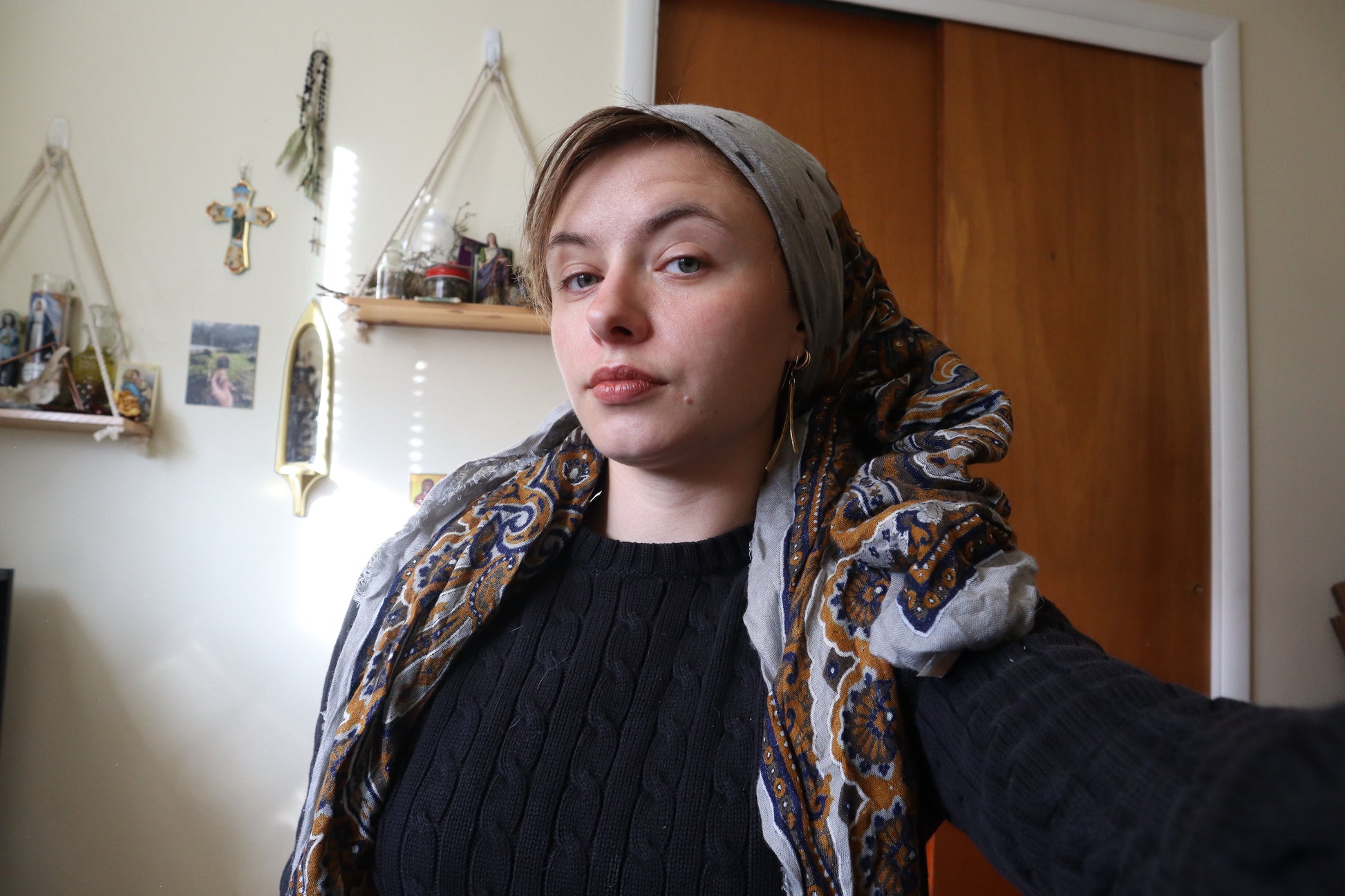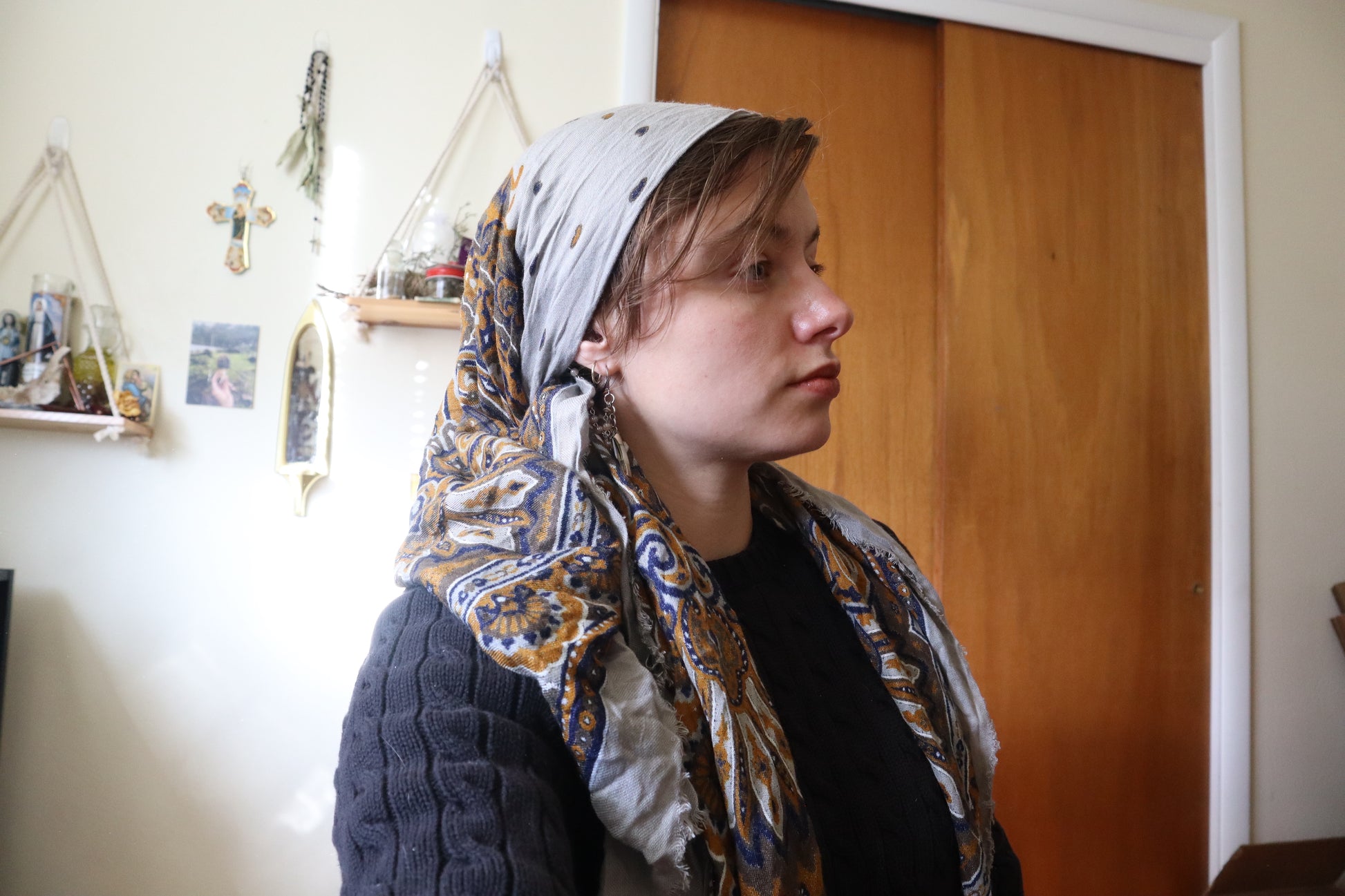 Vintage gray, amber, and black paisley veil that sits at a 49x46 - definitely one of our biggest veils. 100% viscose so a bit of a heftier fabric.