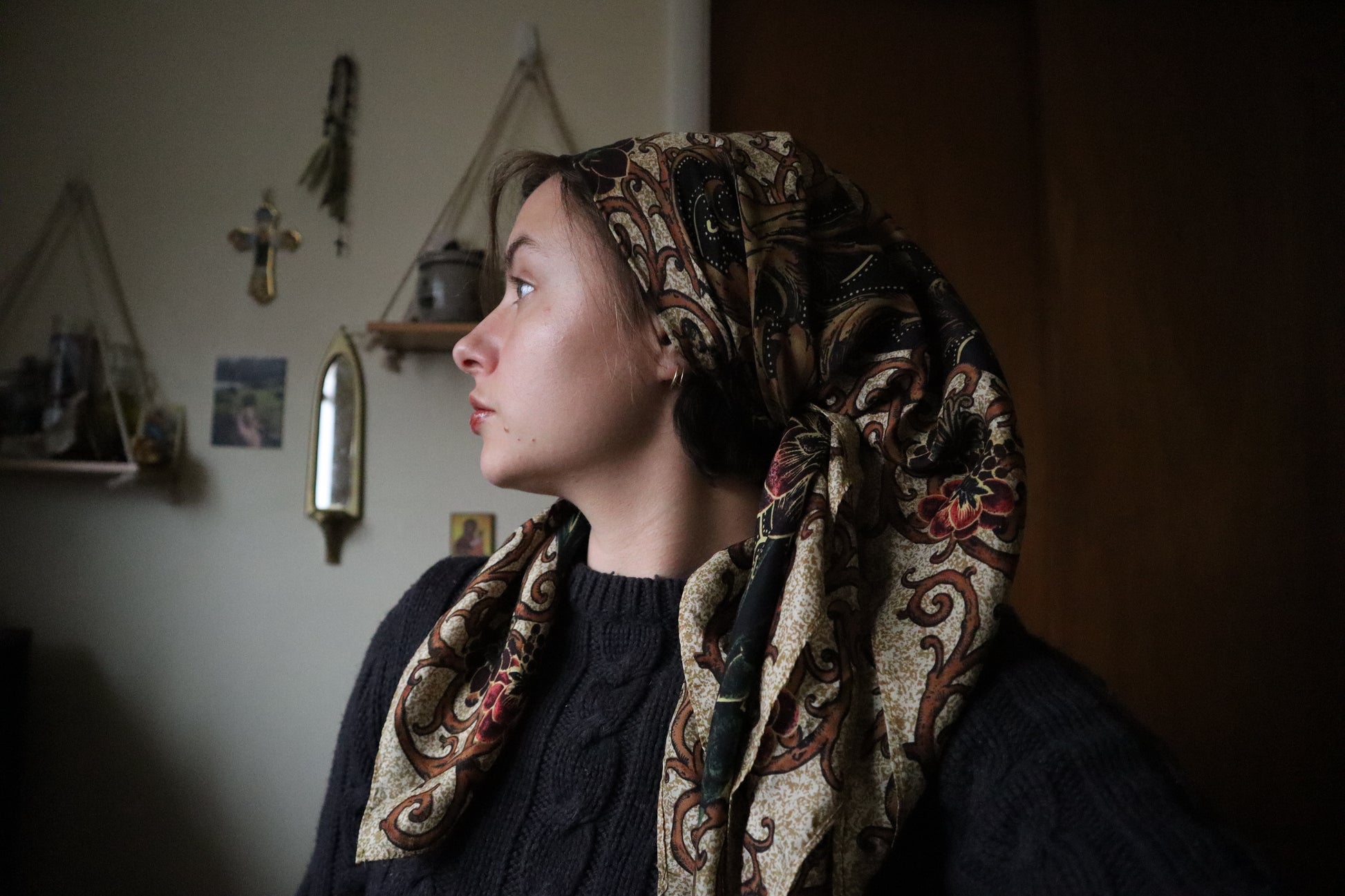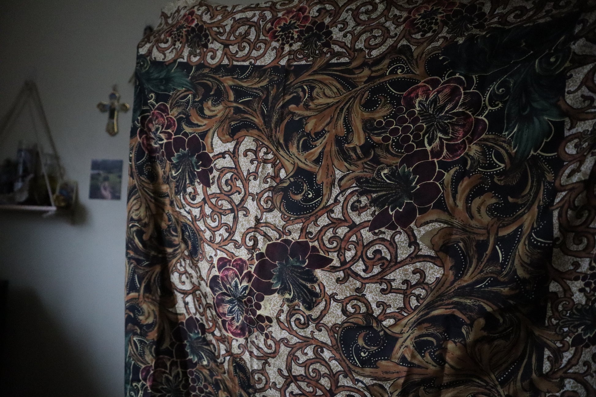 Vintage 34x34 silk, baroque-style veil. Has antique-style detailing and florals in beige, dark blue, and more.