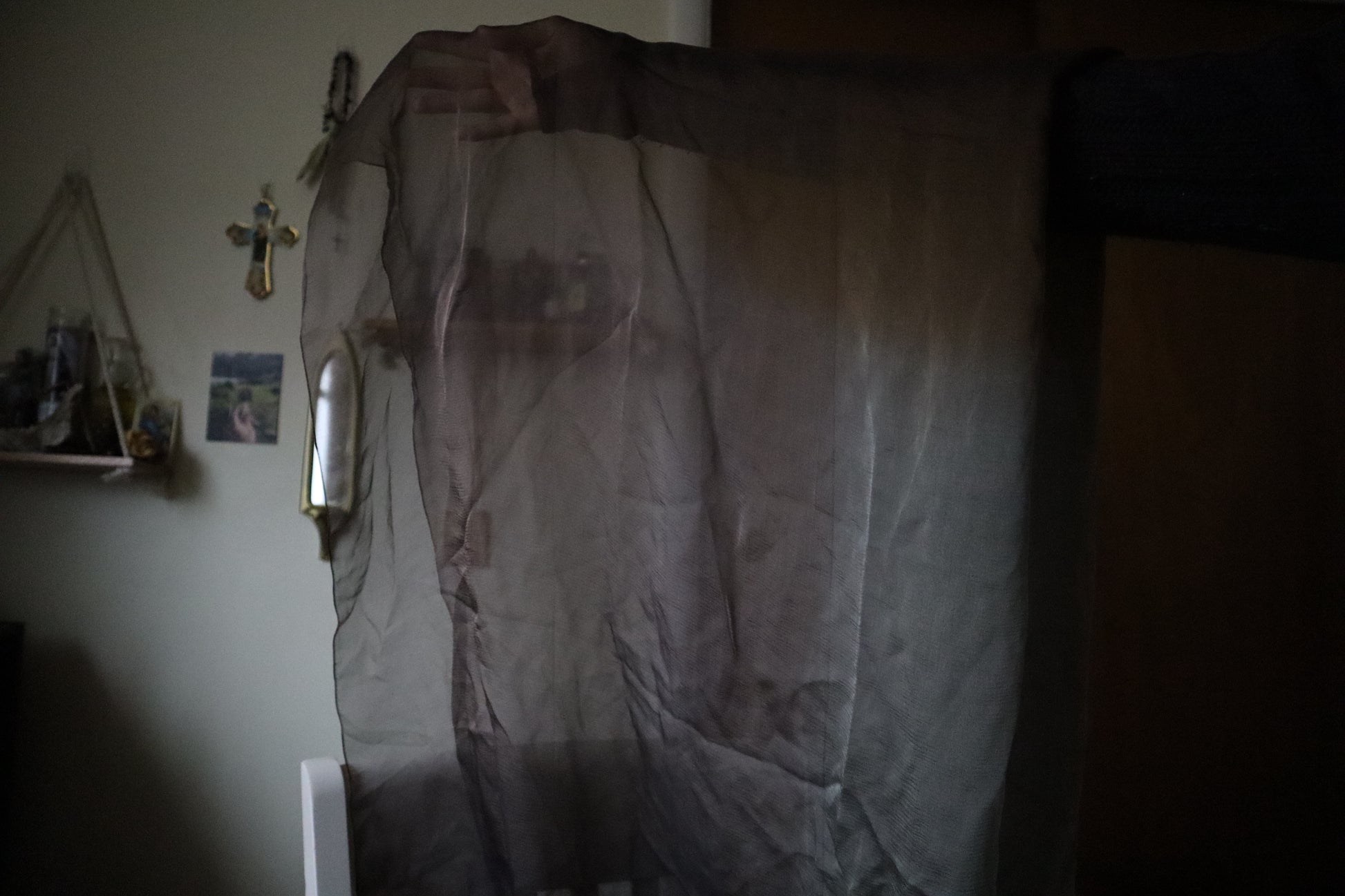 Vintage, semi-translucent brown, green, and sheer/delicate veil. Sits at a 78x36.