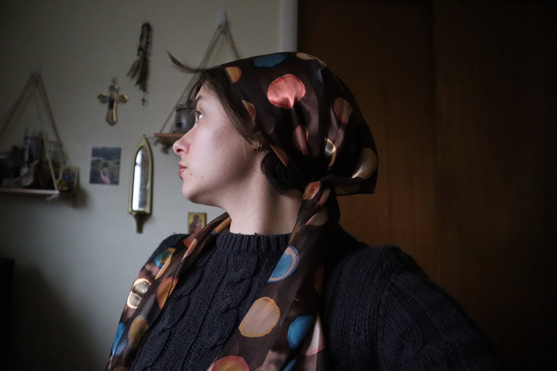Vintage rectangular, dark brown veil with multicolored citrus detailing.