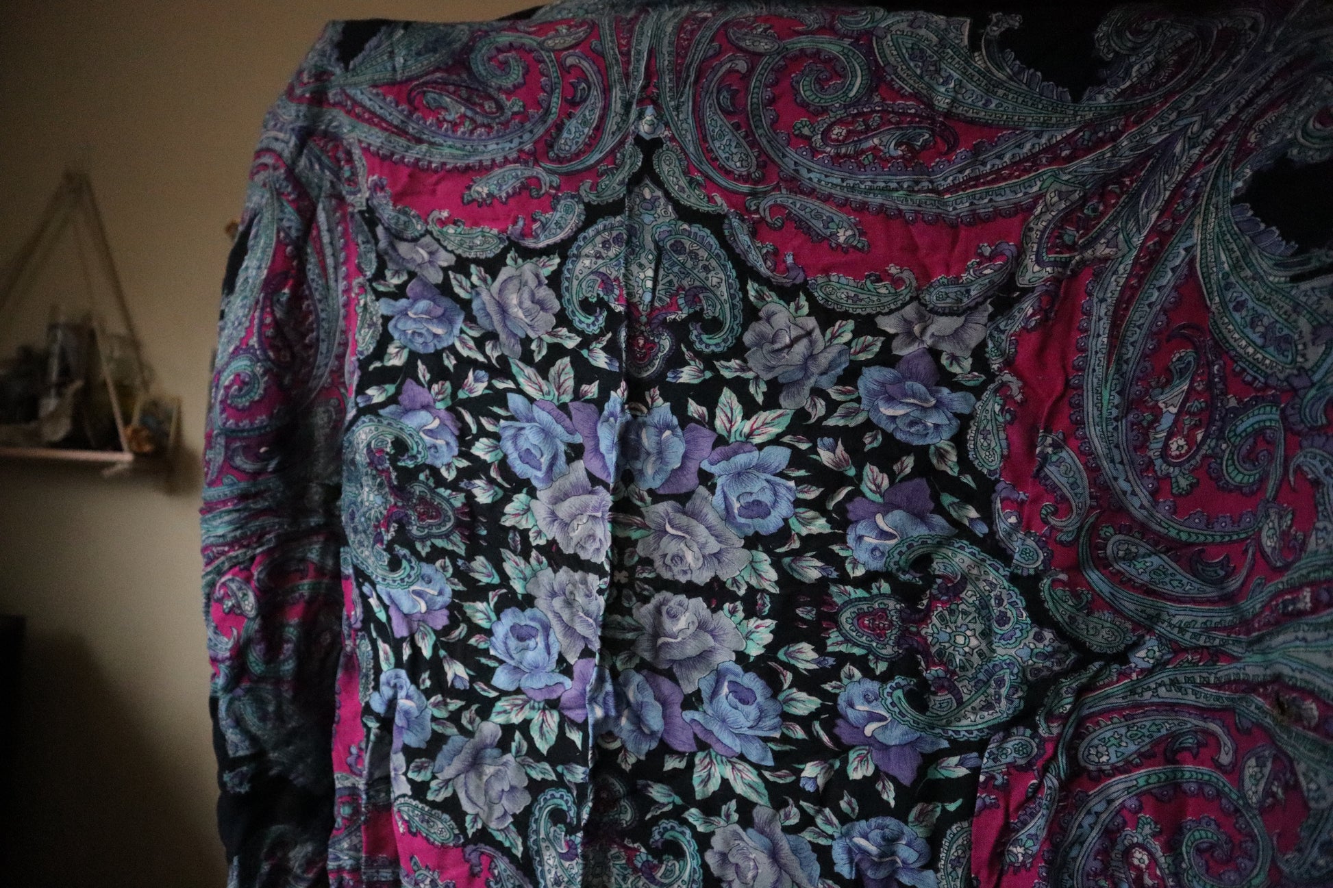 Vintage, heavy-weight black, pink, blue and purple paisley and floral veil. Sits at around a 40x40 or larger.