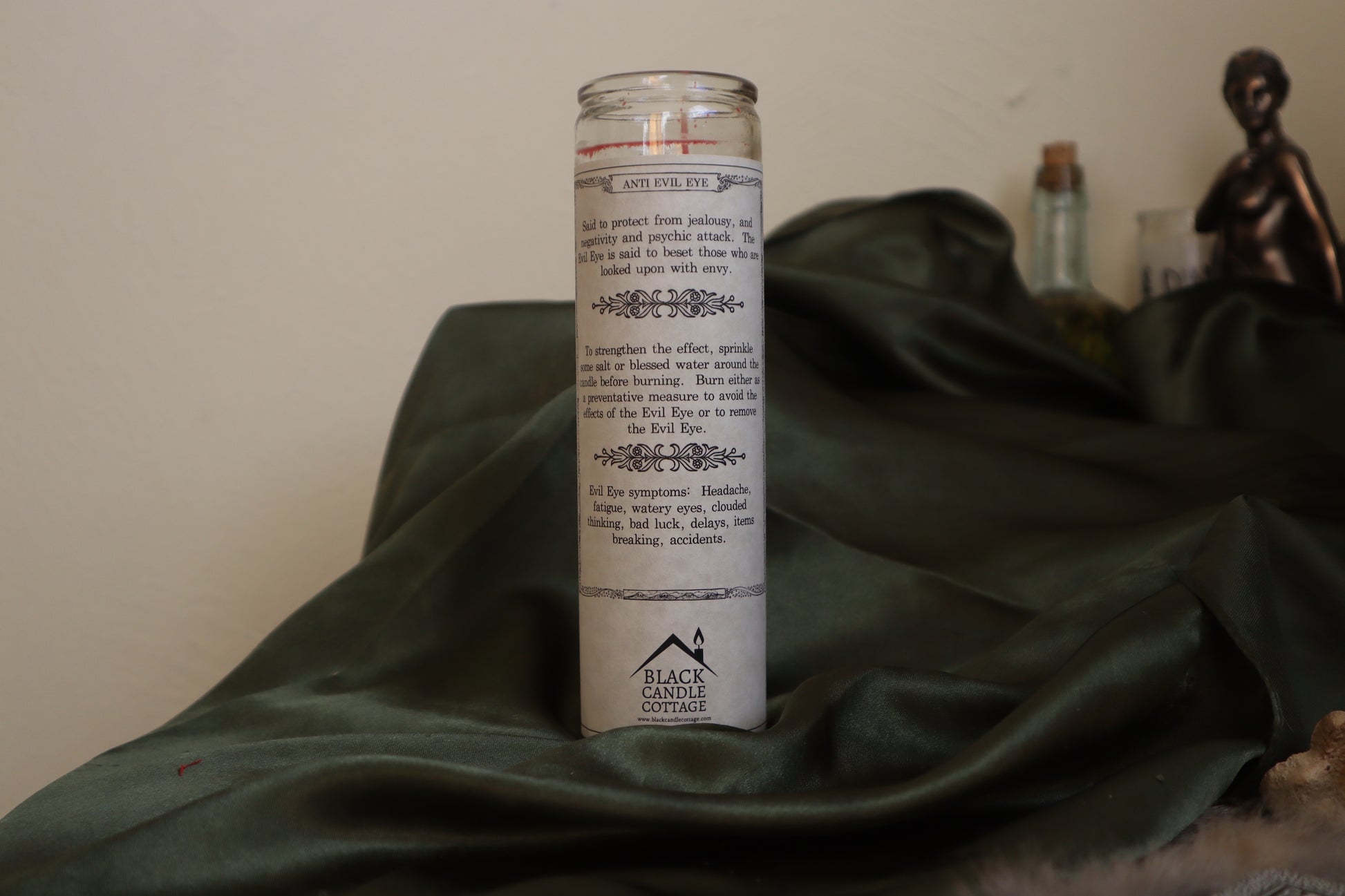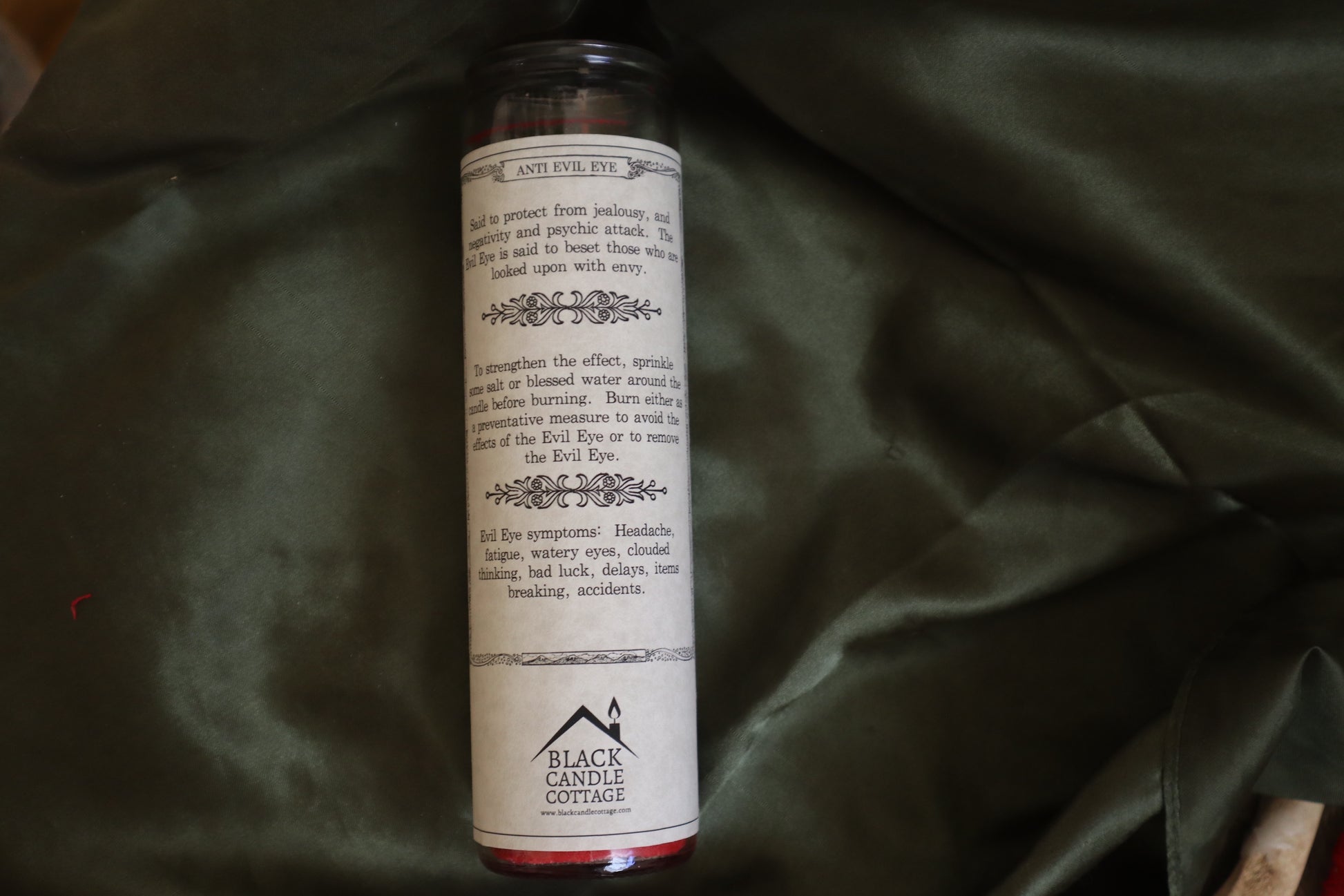 Handmade by Black Candle Cottage. Protect yourself from the Evil Eye or banish it and other negative influences. Made with red, white or blue wax with instructions on the back. May come in blue or red.