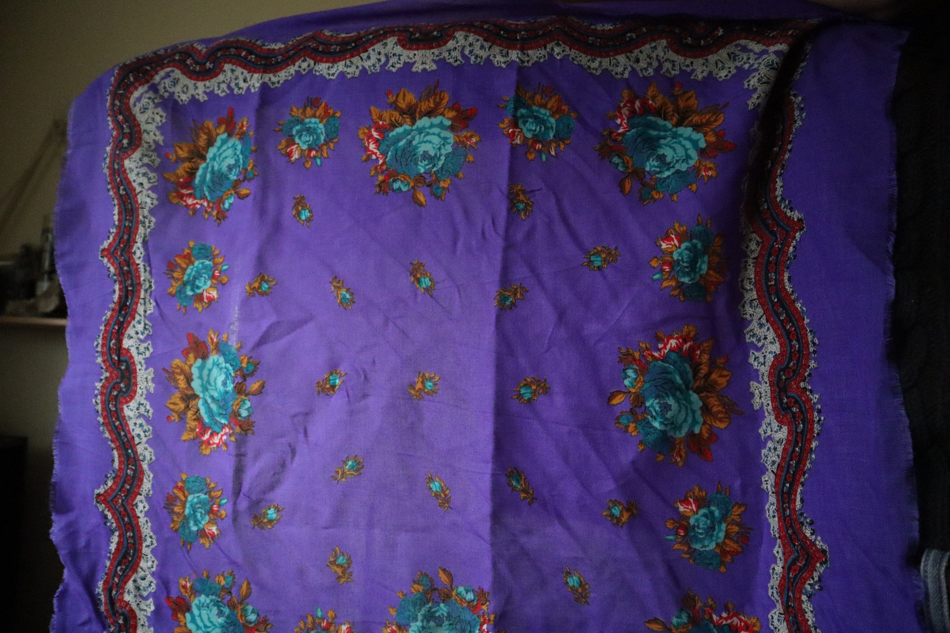Vintage, heavy-weight bright purple veil with colorful green, orange, cream and red detailing around the edges. Sits at around a 26x26 or slightly larger. Definitely a heavier, acrylic-esque material.
