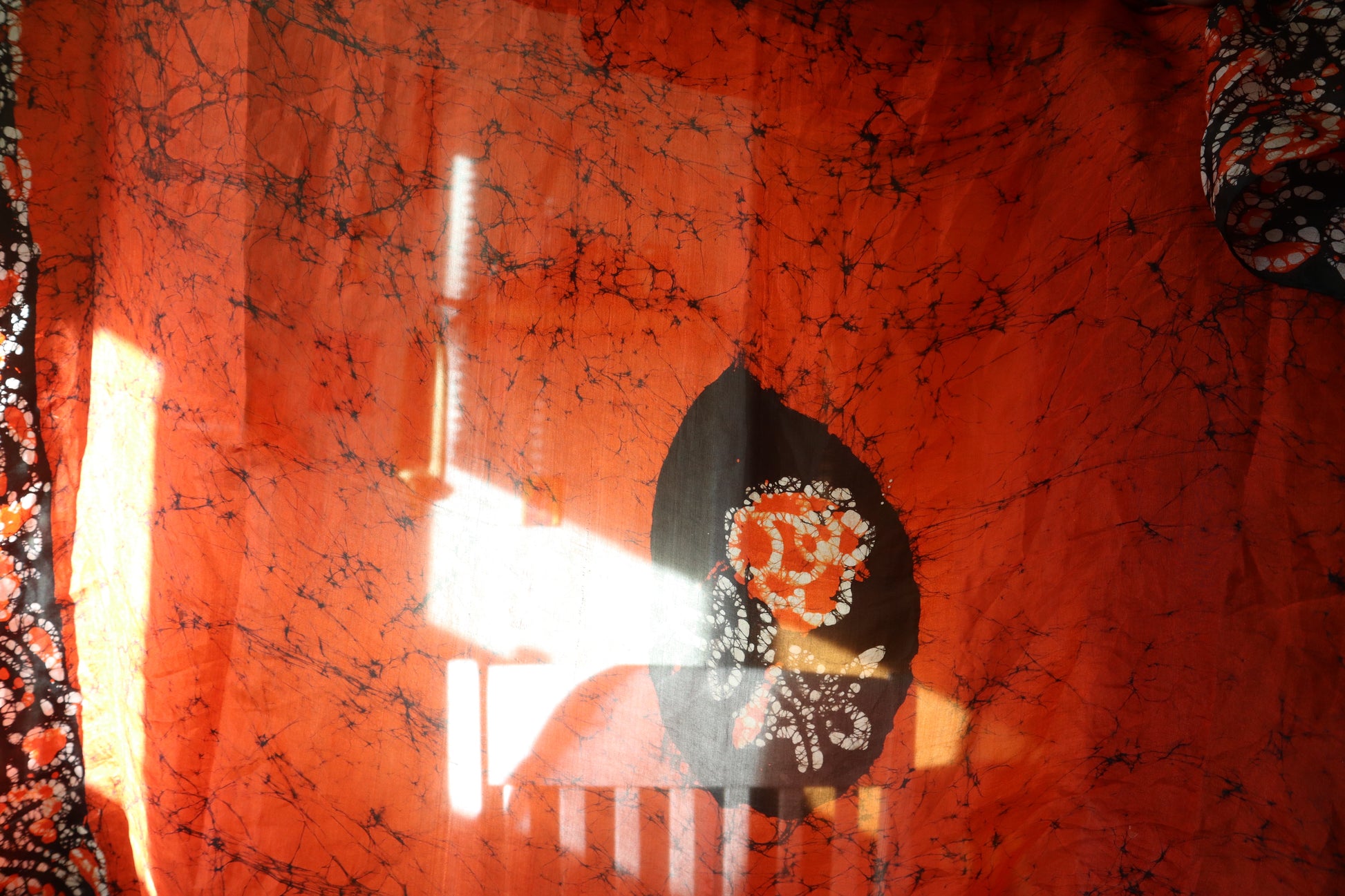 Absolutely gorgeous vintage 100% silk veil with vibrant red and black detailing. Hand dyed.Sits at around 40x40 inches. Very thin, so should go to someone who will ensure to avoid rips and snags!