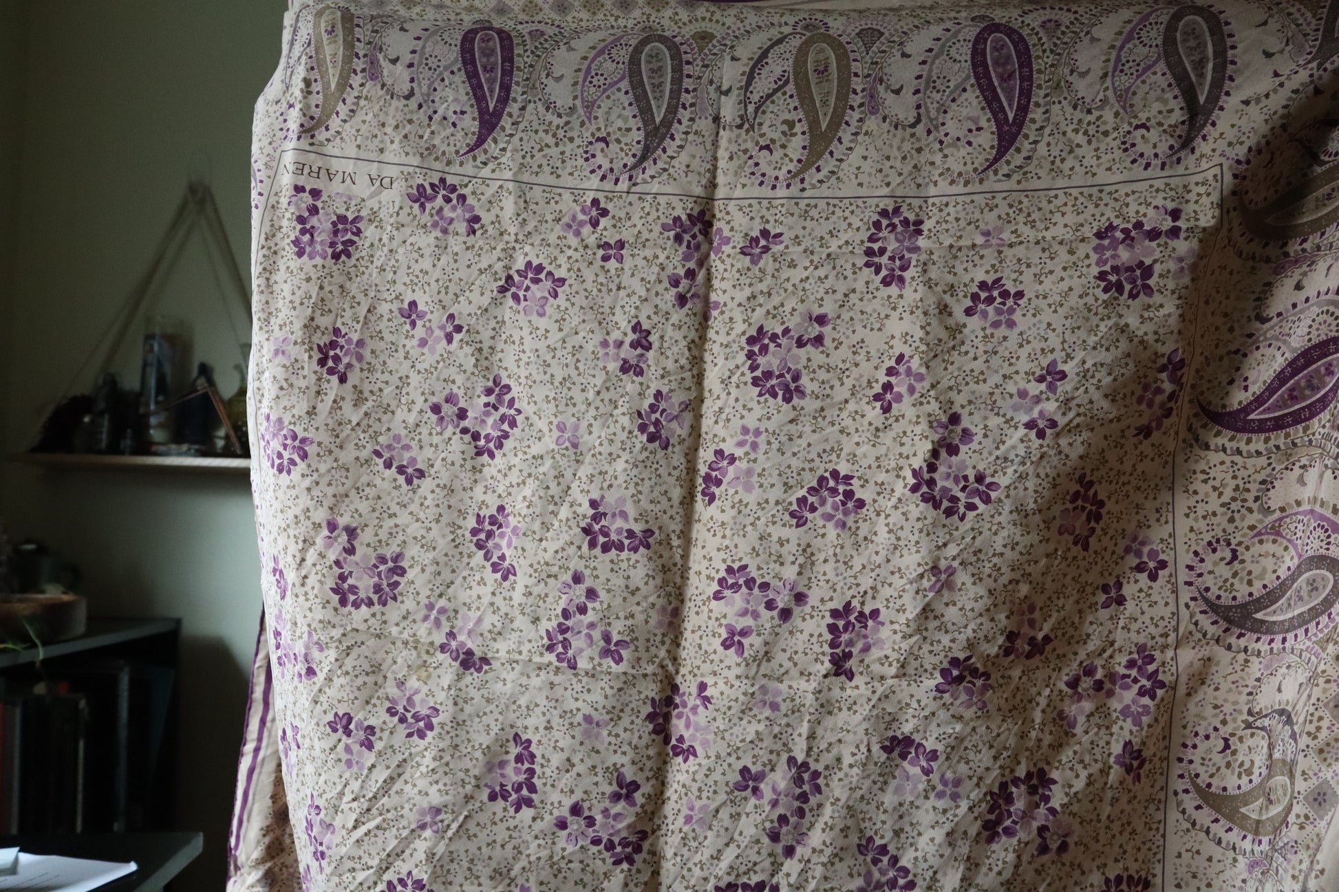 Vintage, 100% silk chiffon light blue veil with a clock pattern. Has some beige and darker blue details as well as elegant paisley. 34x32 inches.