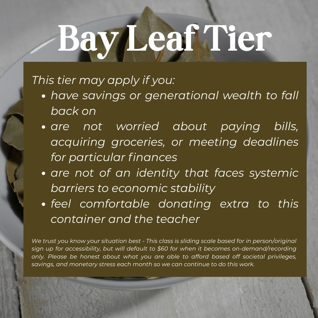 Bay Leaf Tier: This tier is for those in stable and/or upper middle-class economic situations that would like to give extra to the container & teacher for no extra benefits. Please refer to the graphic given if this may apply to you and if you are interested.