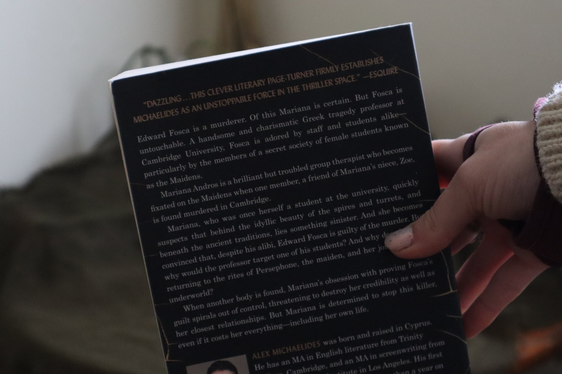 Mariana Andros is a brilliant but troubled group therapist who becomes fixated on The Maidens when one member, a friend of Mariana’s niece Zoe, is found murdered in Cambridge.