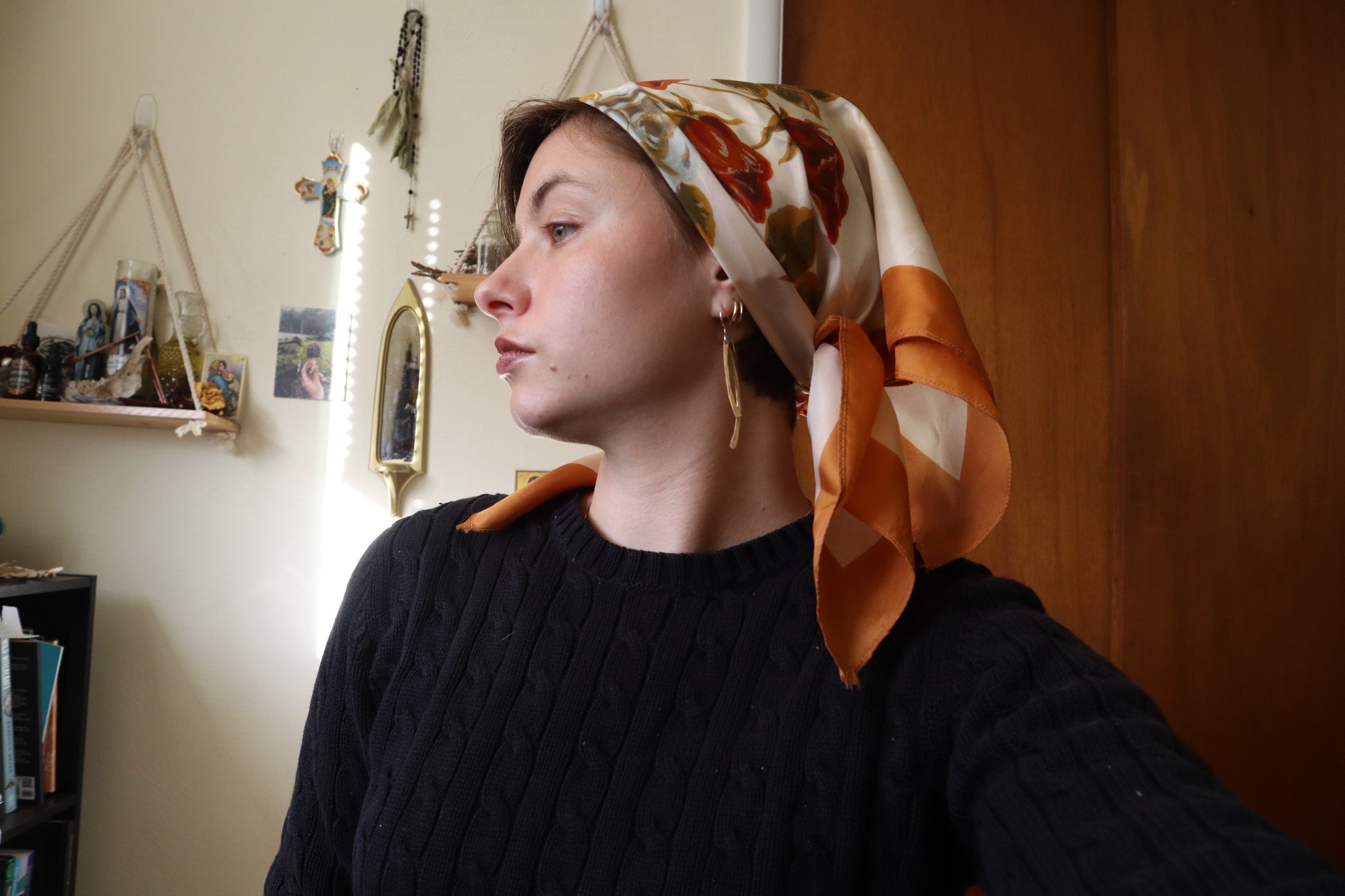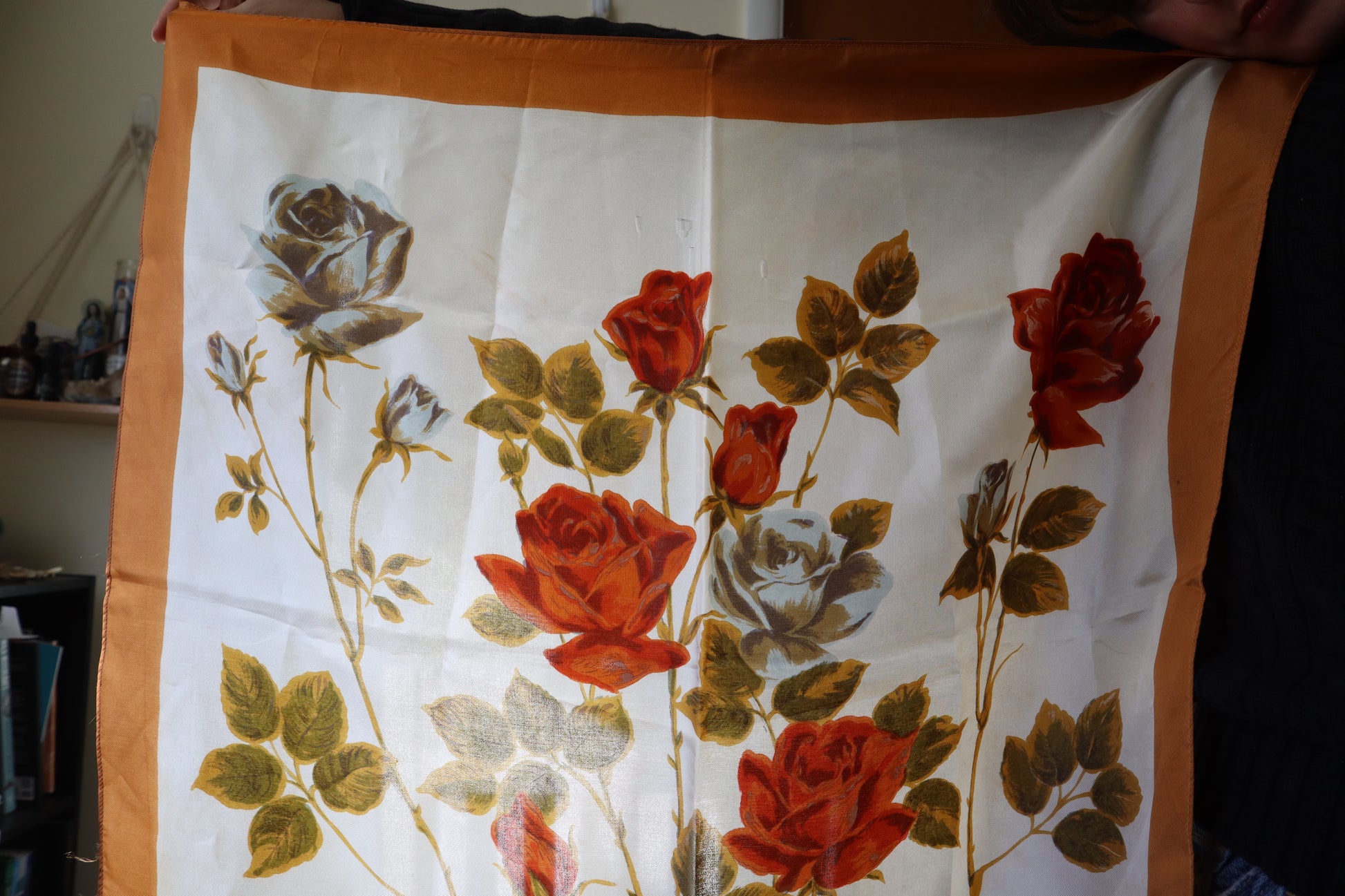 Vintage veil with rusty orange border and bright red floral detailing. Sits at a 24x24. This veil has some stains and light fraying.