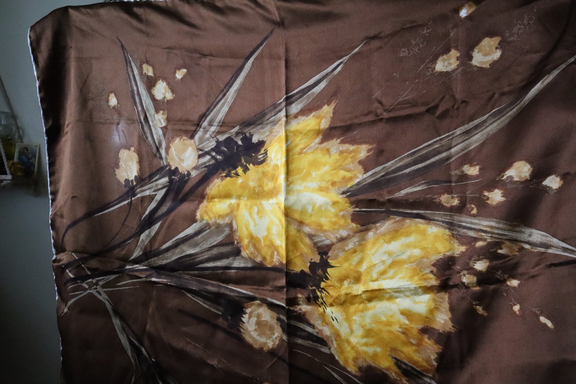 Vintage, 100% silk veil with deep, dark green details and bright red paisley detailing. Hand rolled. Sits around a 34x34.