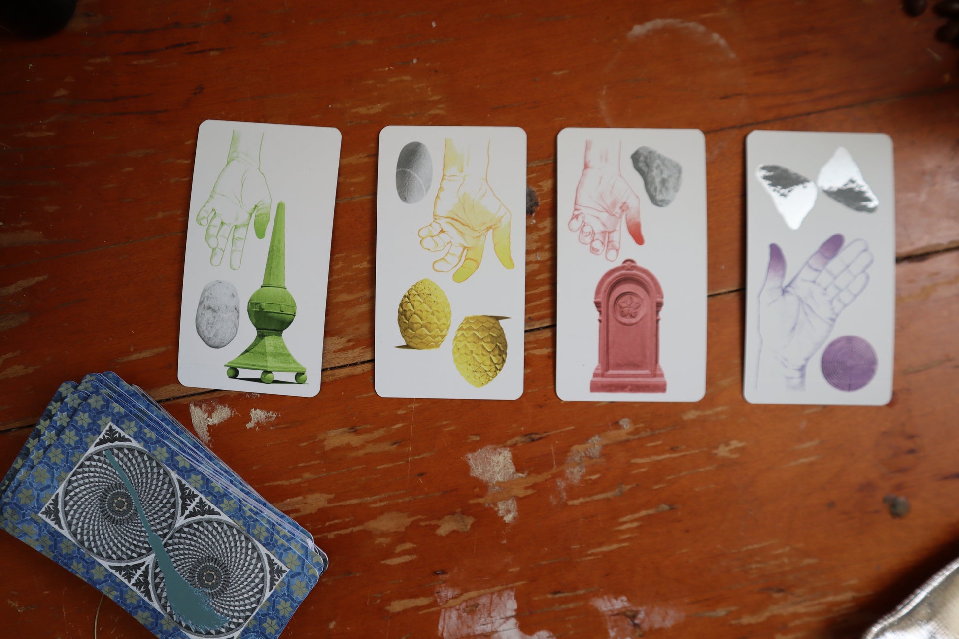 This deck reconstructs Molteni’s favorite Italian card game - Scopa, which translates to “broom”, “to sweep”, or “to fuck” in Italian. The basic goal of the game is to “sweep” the cards off the “floor” or playing surface. The deck’s imagery references sacred stone collections and bead/body-based prayer, incorporating 50 hand-and-stone drawings. Molteni’s original deck departs slightly from tradition to include five elemental/alchemical suits (obelisks/ air, pinecones/ fire, wells/ water, gravestones/ earth, and labyrinths/ spirit or Other and terrestrial planets Mercury, Mars and Venus in place of typical Court card rosters of Page, Knight/ Queen, and King.